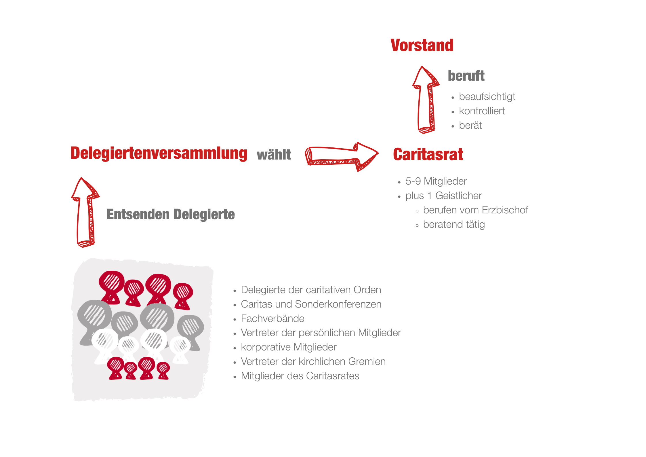 Drei Organe sind gemäß der Vereinssatzung für die Entscheidungsprozesse im Verband ausschlaggebend: Vorstand, Caritasrat und Delegiertenversammlung.